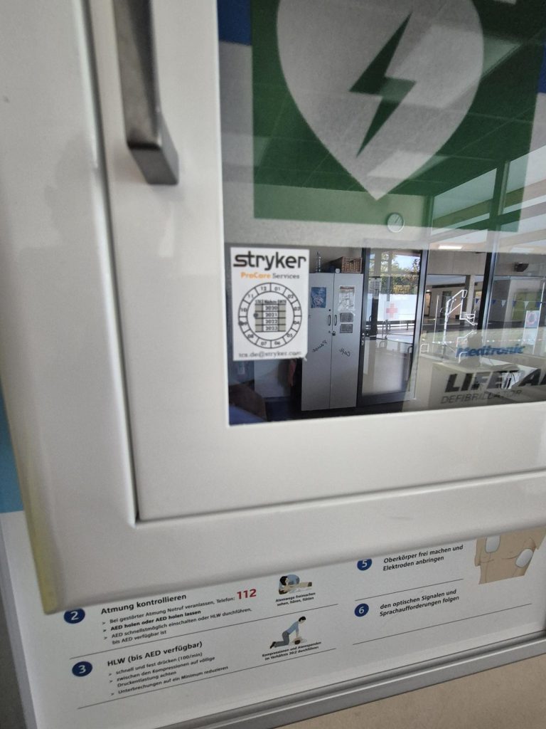 - Der im Eingangsbereich vorhandene Defibrillator hätte turnusgemäß bereits im Jahr 2021 geprüft werden müssen