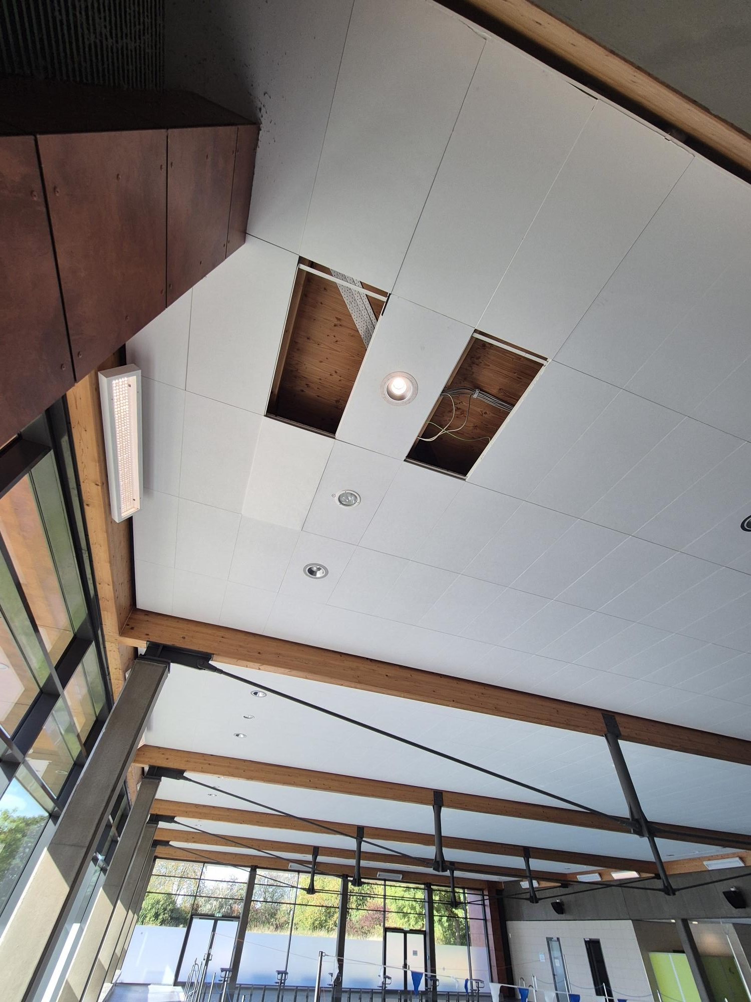 - An der Deckenkonstruktion im Foyer fehlen einzelne Verkleidungselemente, Leitungen sind offen sichtbar